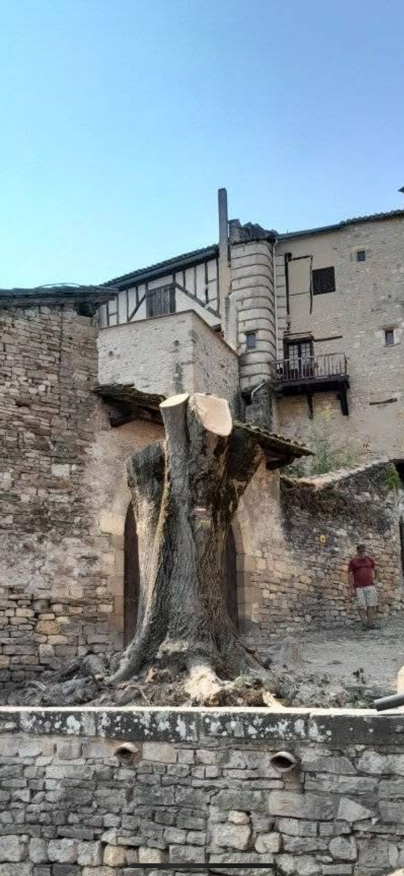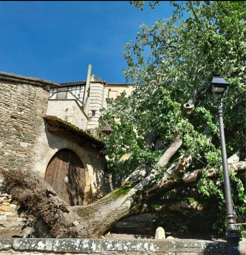 Près de 100 ans environ après sa plantation, Cordes a perdu son arbre emblématique de la montée. C’est lors de la nuit orageuse du 14 août que le géant a succombé, sans bruit, aux assauts du vent. Le tilleul argenté sous la barbacane faisait partie du patrimoine cordais, c’est avec révérence que la « Société des Amis du Vieux Cordes » lui adresse une dernière pensée. La Mairie étudie d’en garder le souvenir.